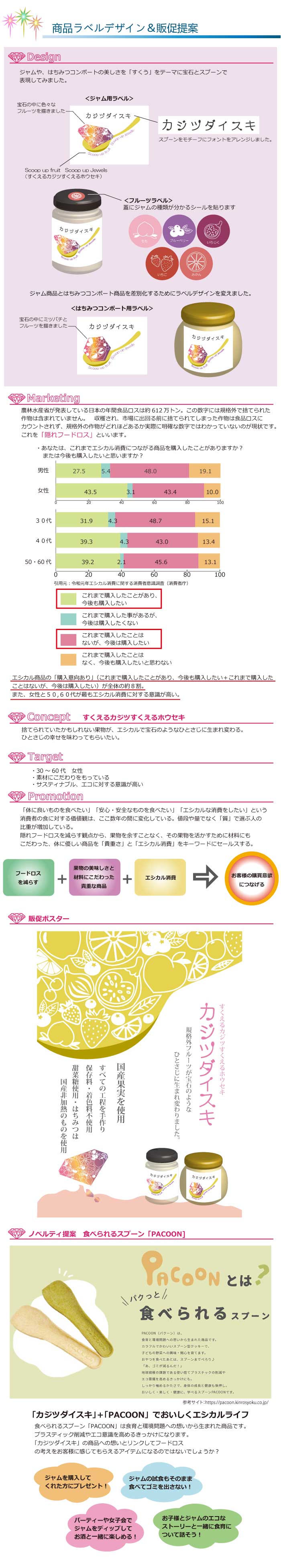 1.商品がフードロス問題がテーマにもなっていたのでフードロスとエシカル消費について消費者の意識をマーケティング調査。 2.ターゲットを30代~60代の女性に設定。サスティナブル、エコに対する意識が高い人。 3.体にいいもの、安心安全な物を食べたい、値段や量ではなく質にこだわりたい人とエシカル消費をキーワードにセールスすることを提案。 4.ラベルデザインはコンセプトの「すくえるカジツすくえるホウセキ」をテーマにカジツダイスキ様のジャムやはちみつコンポートの美しさを宝石とスプーンで表現。 5.販促ポスターは国産果物使用、材料にこだわっている部分をわかりやすくし、宝石で貴重さをアピールしました。ノベルティでは食べられるスプーンを使ってエシカルライフを展開するコラボキャンペーンを提案。 |