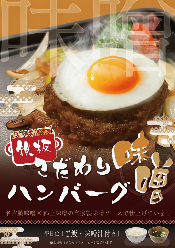 制作課題であるA型看板ポスターには、視認性と食欲喚起を重視し、しずる感のあるハンバーグを大胆に配置した構図を採用しました。通行人の視線を一瞬で捉え、ランチ利用を直感的に想起させる狙いです。