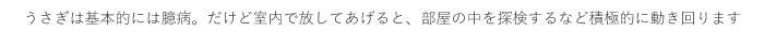うさぎは基本的には臆病。だけど室内で放してあげると、部屋の中を探検するなど積極的に動き回ります
