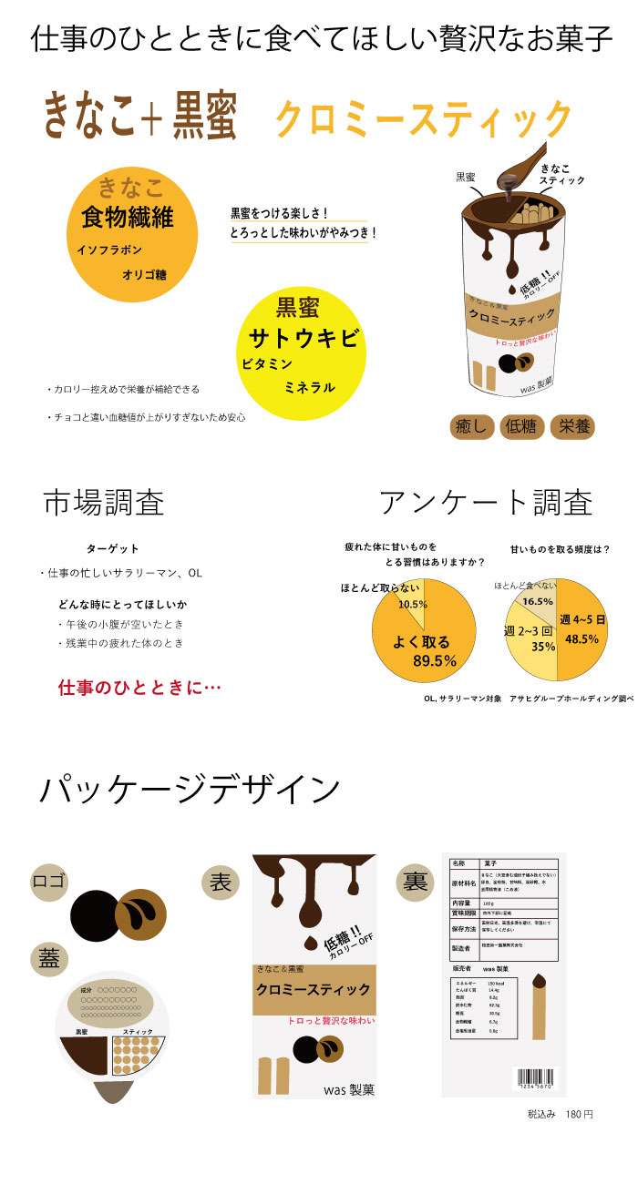 仕事の忙しいサラリーマン、OLの方に取って欲しいお菓子として提案。疲れた時 に甘いものが食べたくなりますが、エネルギーに変換する糖質を取ってほしいとの思いできなこを選びました。