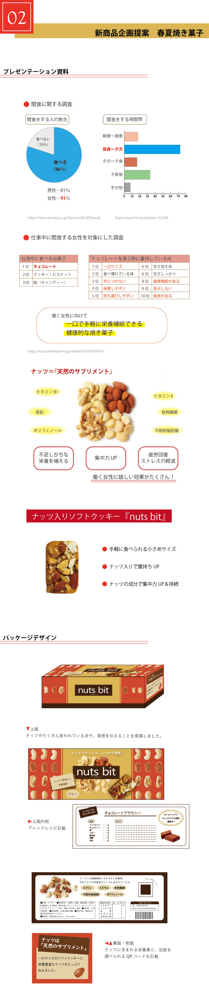 | 制作意図 | 働く女性に喜ばれる焼き菓子になるように、食べる時に音がしないソフトクッキーと栄養豊富なナッツを組み合わせた。 パッケージデザインは、一目でナッツ入りとわかるようにすること、ソフトクッキーとナッツによる食感を伝えること、ナッツの栄養効果を伝えることを意識して制作した。 |