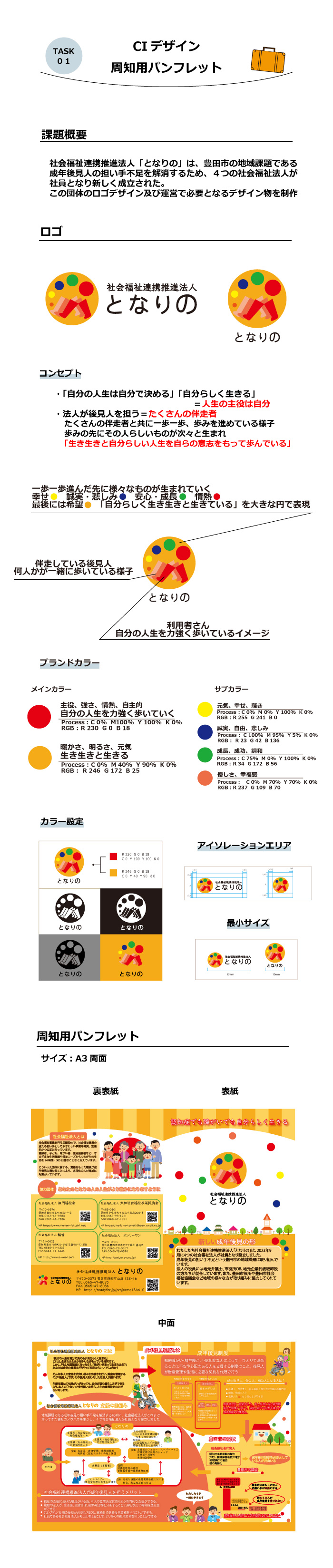 「自分の人生は自分で決める」「自分らしく生きる」「法人が後見人を担う=たくさんの伴走者がいる」という言葉から、たくさんの伴走者と共に自らの人生を力強く歩いている様子を描きました。 パンフレットはロゴのイメージから可愛らしく親しみやすいイメージで描き、成年後見人の制度や「となりの」の支援の仕組みを分かりやすくまとめました。 |