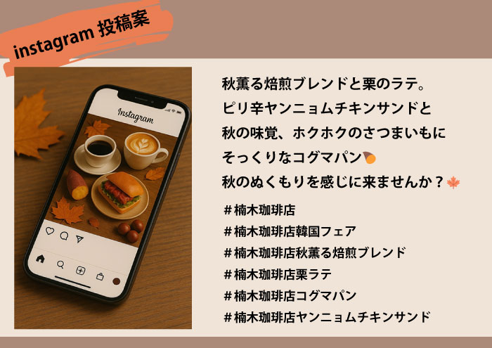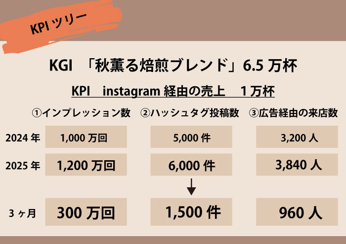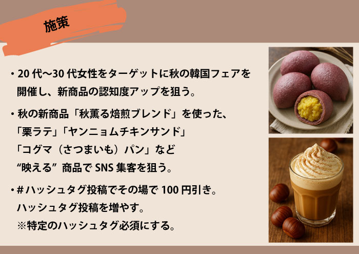 珈琲チェーン「楠木珈琲店」の新商品「秋薫る焙煎ブレンド」の販売促進に向けたマーケティング戦略を策定し、戦略提案スライドを作成する